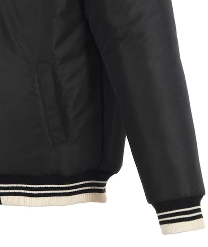- Our Letterman Finals Bomber Jacket’s main body is made with high-quality black polyester for warmth and durability, creating a stylish and contrasting